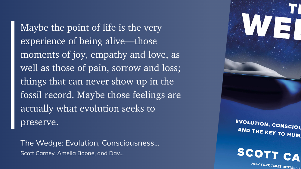 "Maybe the point of life is the very experience of being alive—those moments of joy, empathy and love, as well as those of pain, sorrow and loss; things that can never show up in the fossil record. Maybe those feelings are actually what evolution seeks to preserve." Scott CarneyThe Wedge